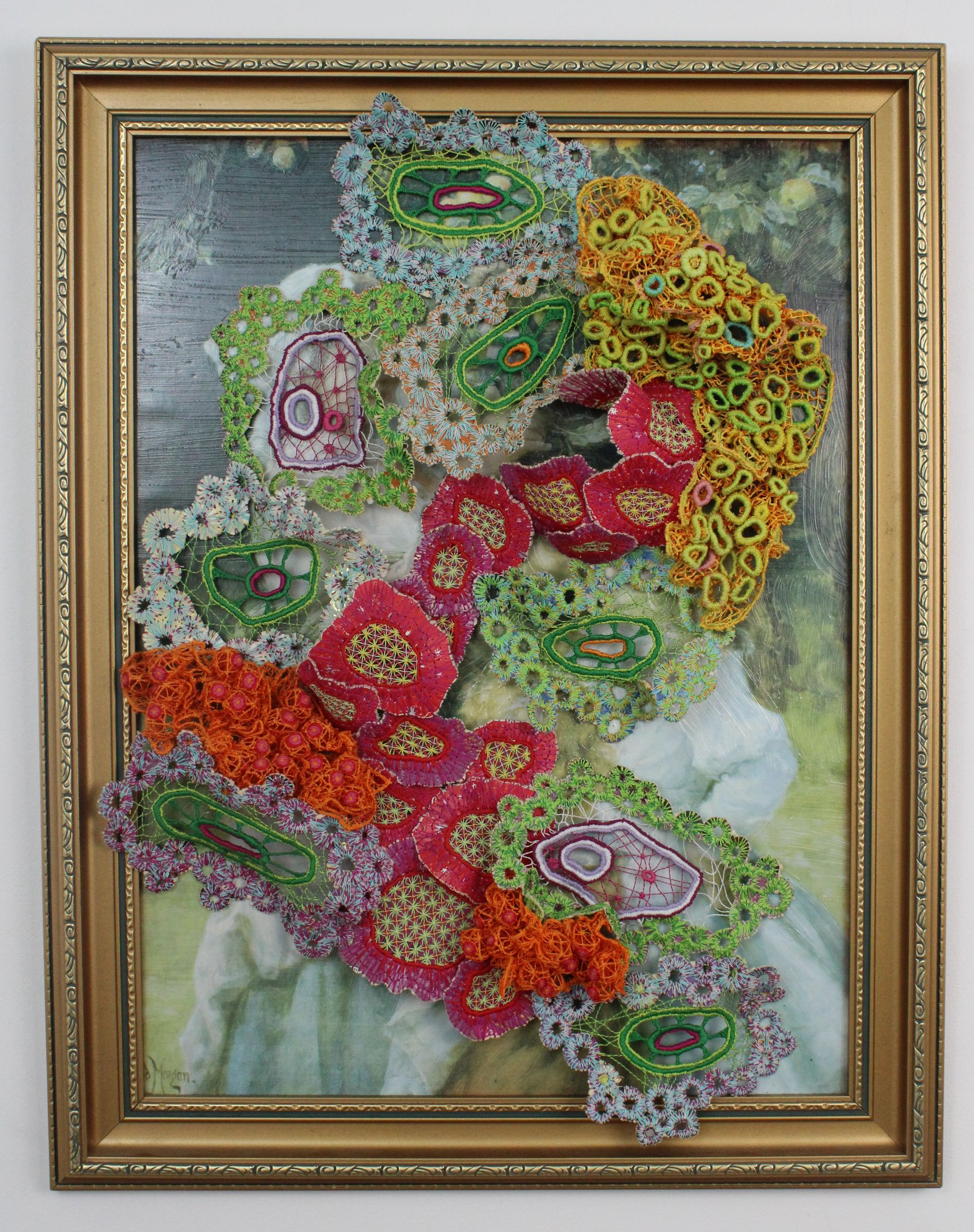 I create embroidered artworks with discarded and recycled materials, using an historical free-machine lace technique pioneered by the embroiderers of the Singer Sewing Machine Company in the late nineteenth century. The lace is built slowly, one stitch at a time, in air, without the use of vanishing fabric.